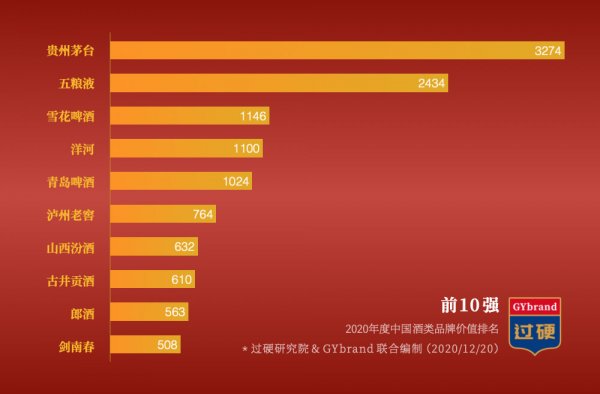 不久前,GYbrand发布了2020年度《中国酒类品牌价值排名100强》,这个榜单考量了全国数百家酒企在过去一年的市场业绩、品牌强度和品牌贡献等综合表现。根据数据显示,2020年中国名酒排名前十名的品牌价值合计12054.85亿元,其中,贵州茅台以3273.75亿元的品牌价值荣膺2020中国酒类最具价值品牌。酒文化是中华民族饮食文化的重要组成部分。下面跟一起来看看2020年中国十大名酒排行榜,贵州茅台独占鳌头!感兴趣的不妨一起往下看!