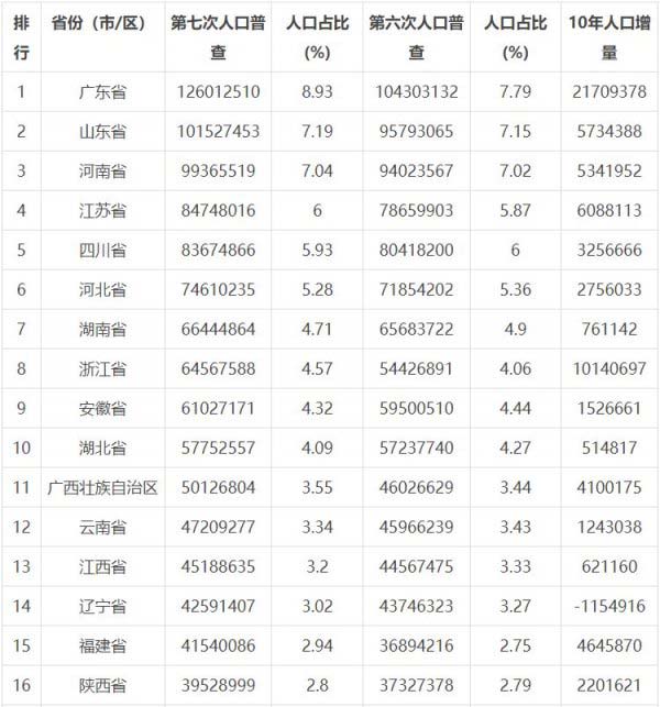 排名第一是广东省,总人口数为126012510人,与2010年第六次全国人口普查相比,增加了21709378人。男性占比53.07%,女性占比46.93%。