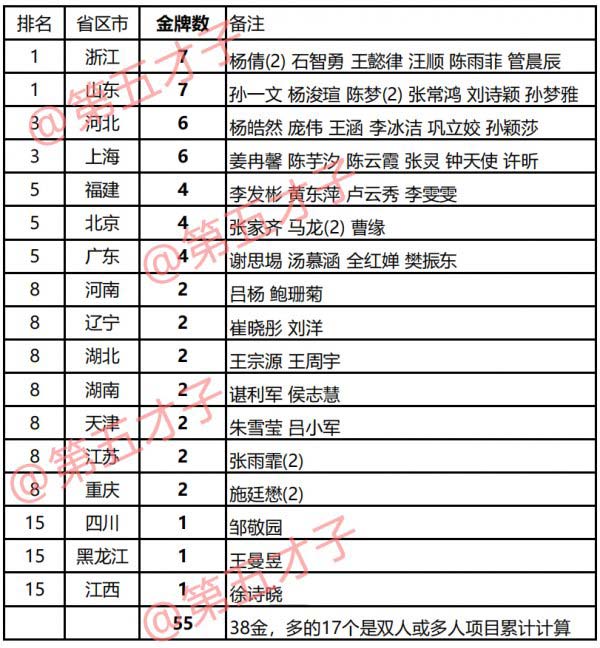 各省区市金牌榜上,浙江和山东以7块金牌并列榜首。浙江的杨倩,山东的陈梦,各获得两块金牌。[bai]