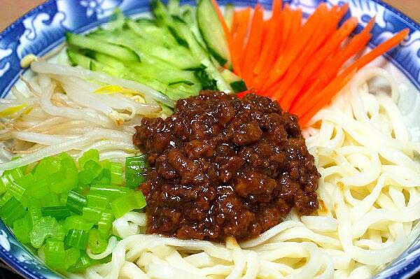 老北京炸酱面是北京非常有名的一道传统小吃,在天津、河北等地也非常流行,是以当地秘制的炸酱拌面条而成,加上肉丁葱姜炒制浇到“过水面”上,再拌入黄瓜、香椿、豆芽、青豆等配料,吃起来非常美味可口,是老北京人最爱的主食之一。