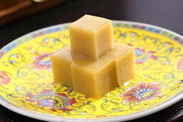 豌豆黄是北京春季的一种应时糕点,常见于春季庙会上,因慈禧喜欢此物而得名。这道小吃是用豌豆和白糖制成的,其制作工序比较繁琐,成品外观色泽美观,吃起来清香可口。