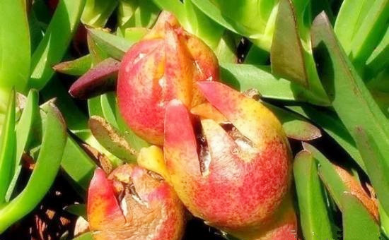 这种来自南非海边山岭的番杏科植物,长有繁茂的肥厚肉质叶片,能开出红、花、紫各种绚烂的花朵,开花之后结出的莫邪菊果有点像营养不良的石榴,而欧洲人更喜欢把它们叫做猪脸果。莫邪菊果的可食用部分形如上大下小的锥形,常被称为海滨苹果或是霍屯督无花果。