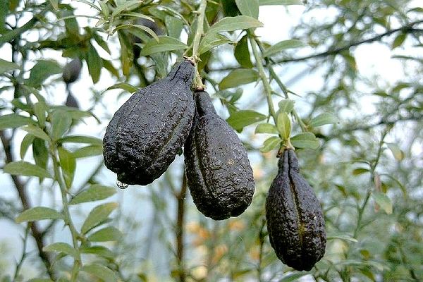 这是来自澳洲的杂交卡卡杜酸橙,一种正宗的柑橘类水果,原生卡卡杜酸橙是一种疙疙瘩瘩的绿色野果,曾经长期充当澳洲土著人的维生素来源。与同样产自澳洲的指橙合体之后,杂交品种的卡卡杜酸橙摇身一变成为妖异的黑褐色,口味也是酸涩至极,也不明白为什么要杂交培育这样的水果。