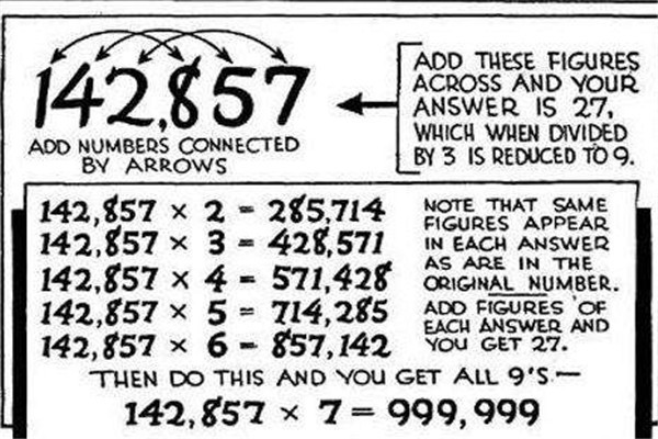142857这组数据也非常的神奇,虽然看起来没有什么特别的地方,但是如果将这组数据,分别去乘1、2、3、6,然后就会发现一个非常神奇的结果,就是所有的数字仅仅调换了位置,但是在这组数据里面还是拥有142857。还有一个重要的发现就是这组数据,与埃及的 金字塔 有一定的关系。所以很多科学家一直在怀疑在这组数据中可能隐藏着一个巨大的秘密。