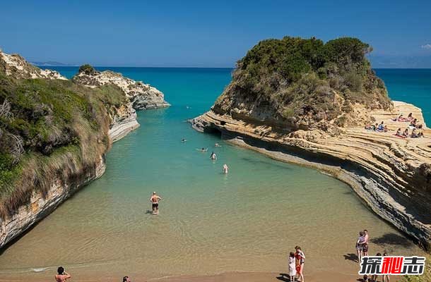 在希腊的科孚岛海滩上最著名的地标是不寻常的悬崖构造,被称为“爱的通道”。根据传说,如果一对夫妇一起在周围的水中游泳,他们将永远在一起。