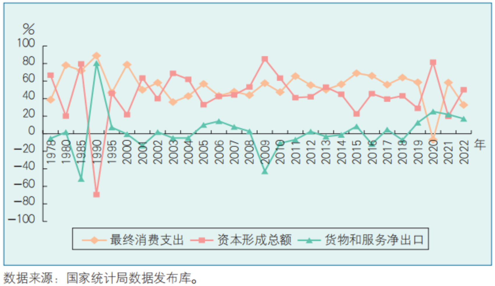 图2 1978—2022年“三驾马车”对GDP增长的贡献率